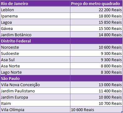 Todos os meses, a Fundação Instituto de Pesquisas Econômicas (Fipe) divulga, em parceria com os site de classificados Zap, um índice com a média dos preços dos imóveis em dezesseis municípios brasileiros. De acordo com o último levantamento, Rio de Janeiro, Brasília e São Paulo lideram, nessa ordem, o ranking das cidades onde o metro quadrado custa mais.